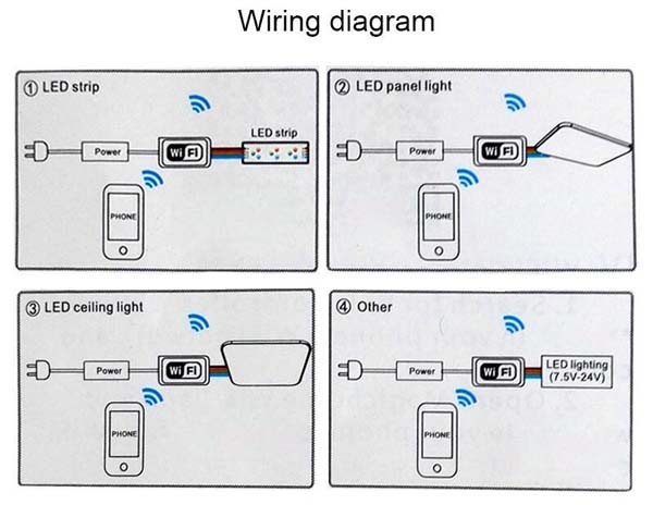 1)Connect WiFi controller correctly, power supply→WiFi controller→LED lighting