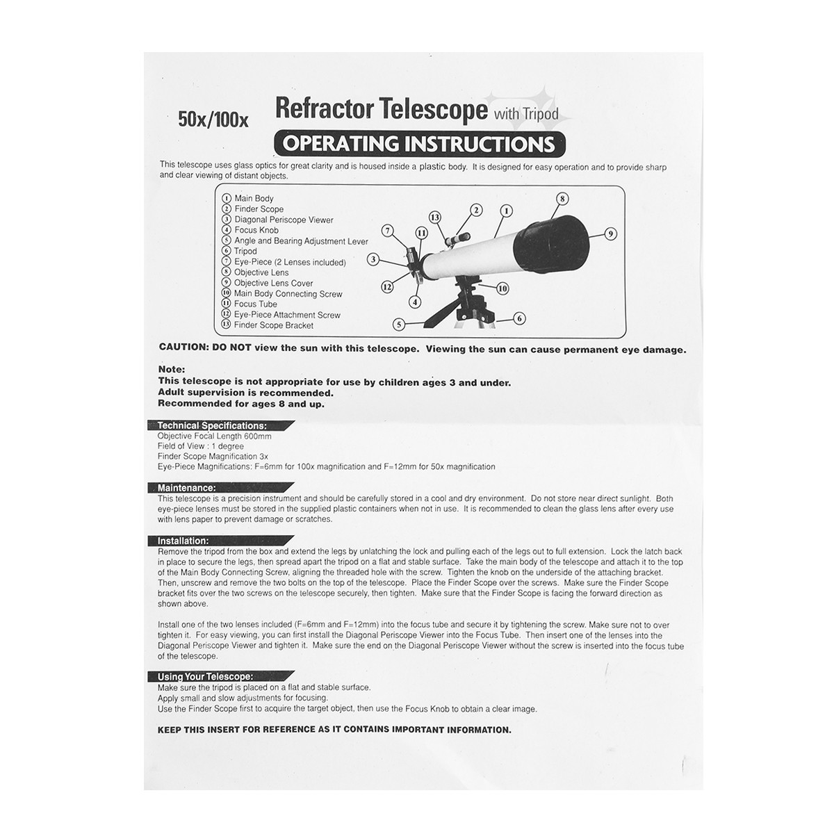 : With 600mm focal length, This refractor telescope has a larger magnification and a more stable multiplier. 50mm Large aperture objective lens makes the images brighter and clearer, achieve large field of view.