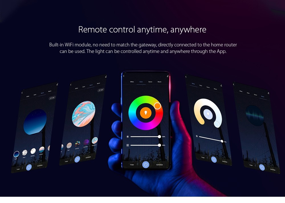 Built-in WiFi module, no need to match the gateway, directly connected to the home router can be used. The light can be controlled anytime and anywhere through the App.