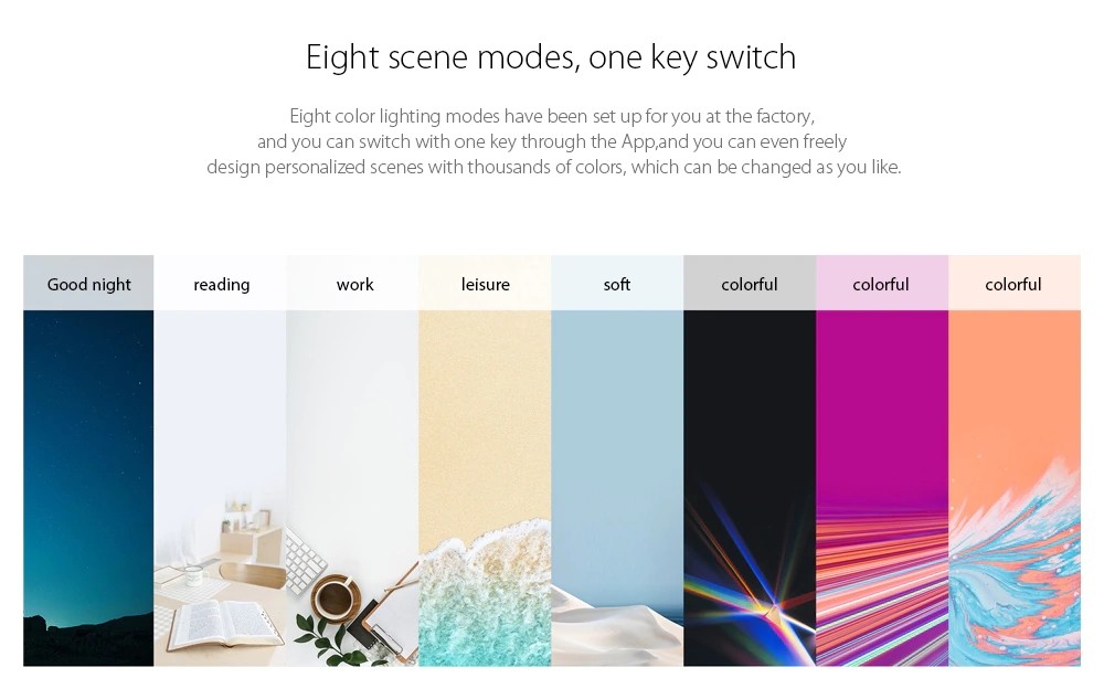 Eight color lighting modes have been set up for you at the factory, and you can switch with one key through the App, and you can even freely design personalized scenes with thousands of colors, which can be changed as you like.