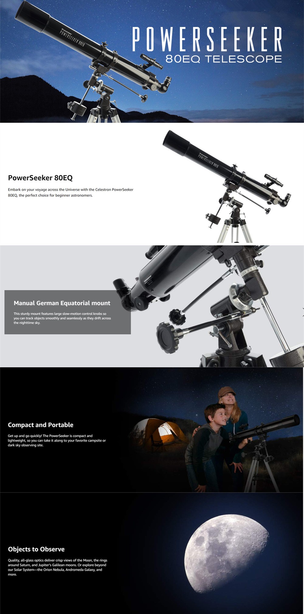 PERFECT BEGINNERS TELESCOPE: The Celestron PowerSeeker 80EQ is an easy-to-use and powerful telescope. The PowerSeeker series is designed to give the first-time telescope user the perfect combination of quality, value, features, and power.