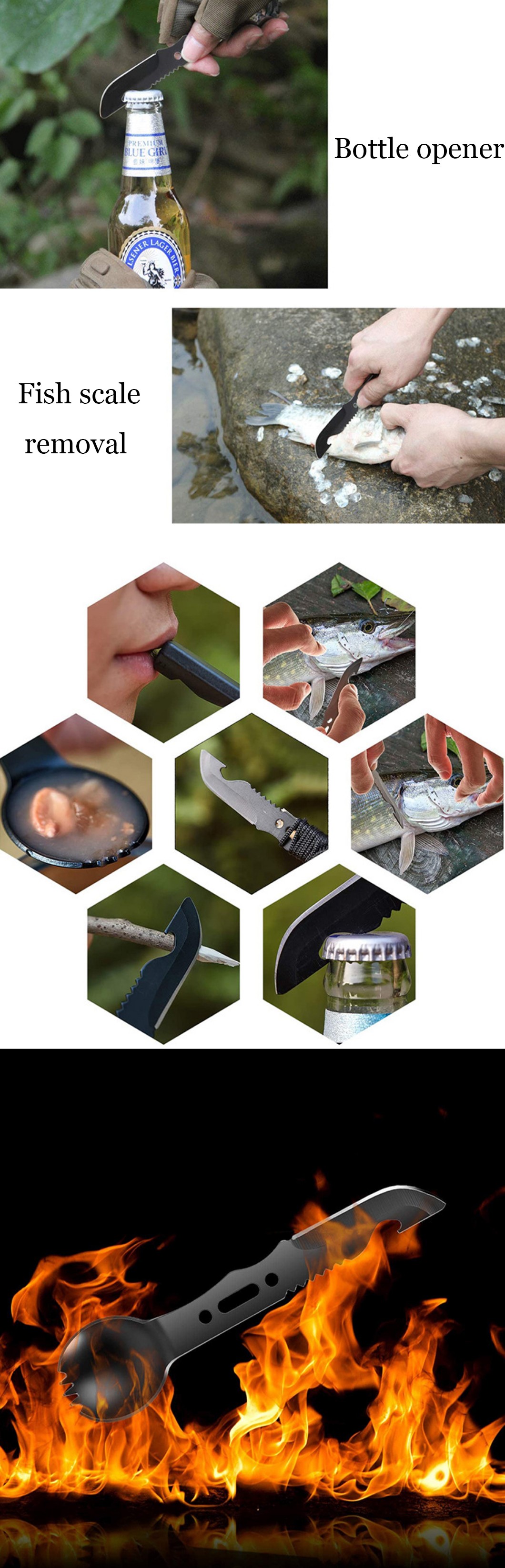 3.Multifunctional use, you can open the belly of the fish, cutting branches, rice spoons, scraping fish scales and other uses.