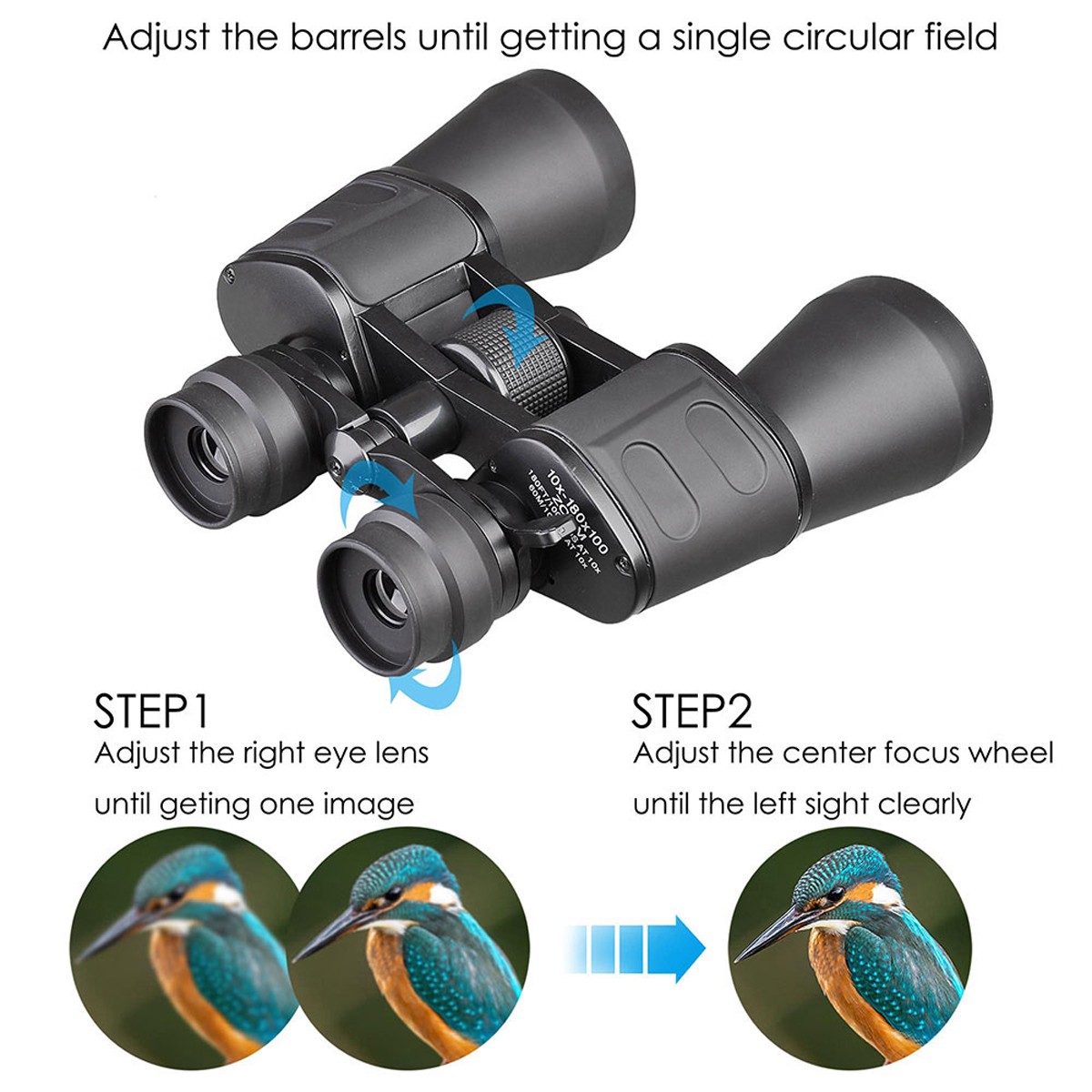 1. Close your right eye and sight an object with your left eye. Focus the binocular by rotating the center focus wheel until the image is sharp and clear.
