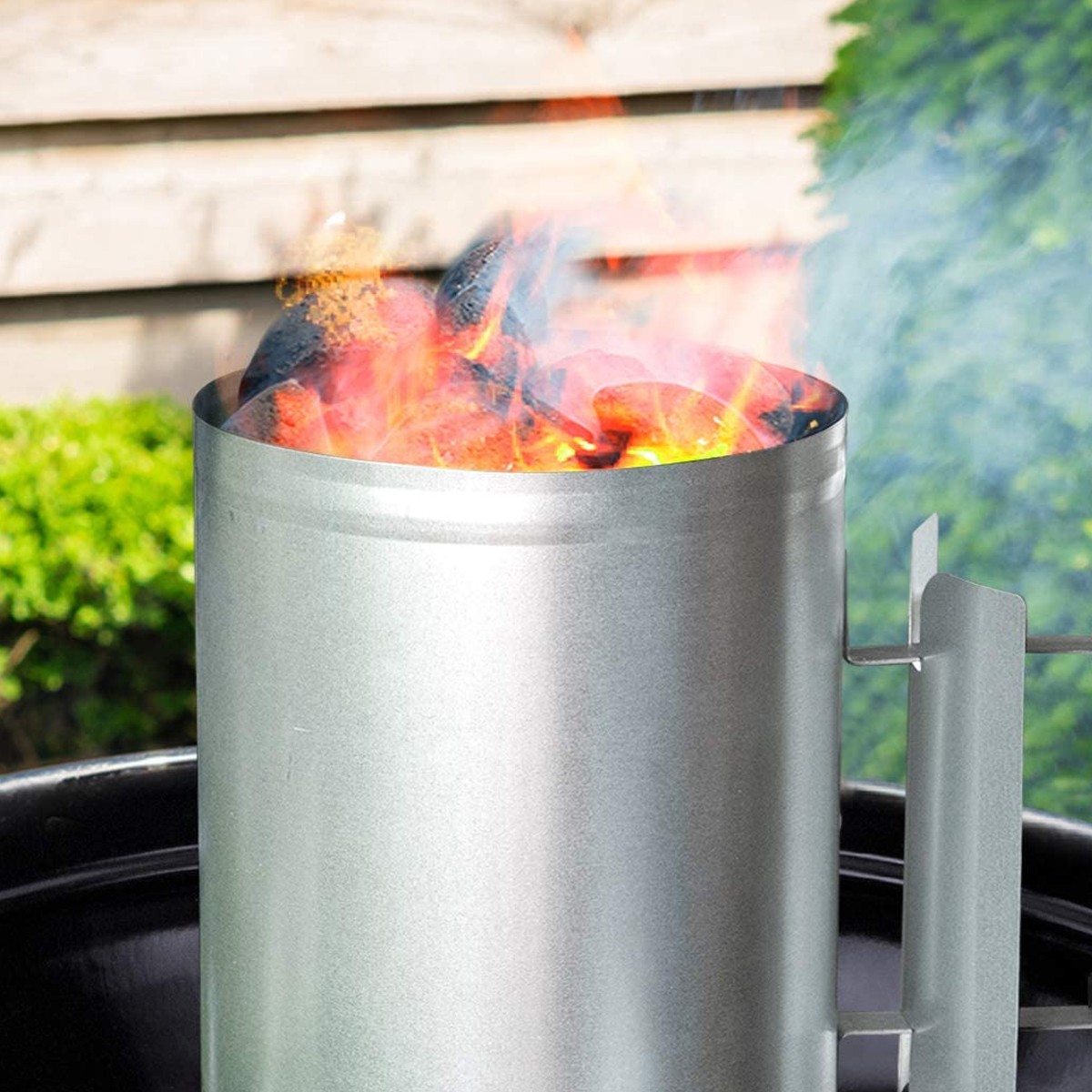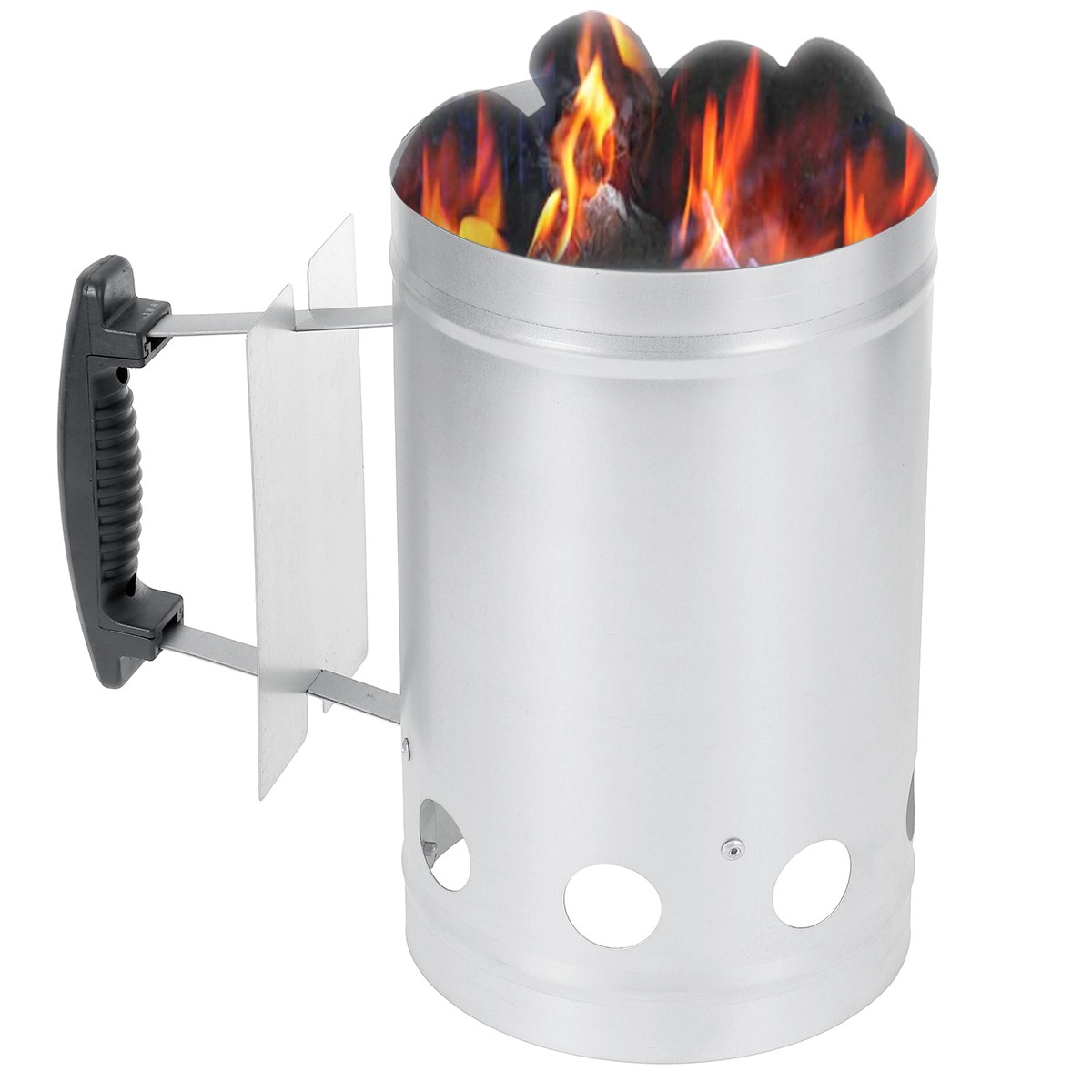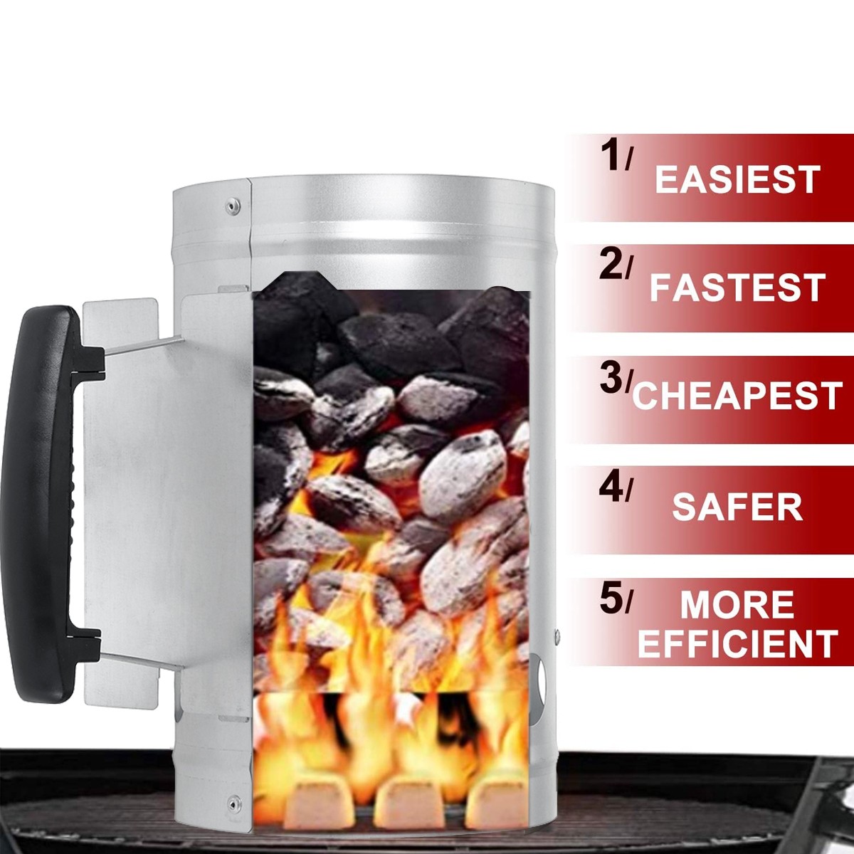 【EASIER】Charcoal chimney starter grill just use some abandon newspapers or other papers at the bottom of steel canister. light up crinkled up newspapers or papers with fire starter, and set the can cannister of coal starter over the flame. Please note: no more buying flammable bottles of liquid to squirt over your charcoal briquettes before lighting them.