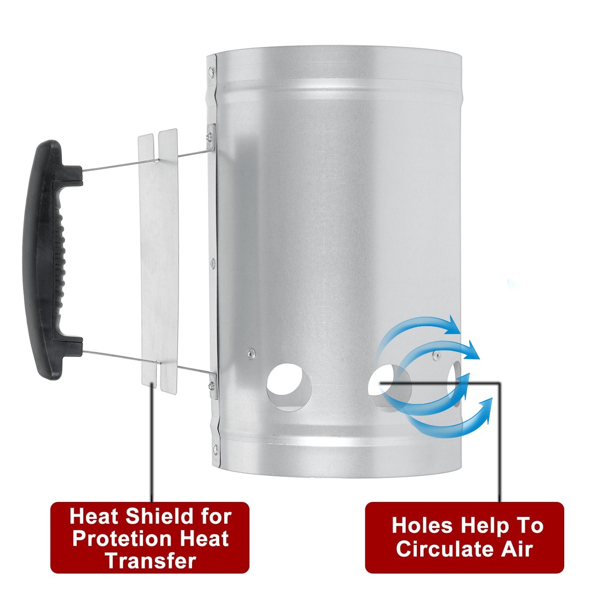 【EASY TO USE AND PORTABLE】The large size of the chimney charcoal starter base and air vents shortens the amount of time it takes to heat up the charcoal. a nylon handle plus heat shield of charcoal starter for protection against heat transfer. charcoal chimney lighter fits perfectly all kinds of briquette charcoal BBQ, grill, outdoor cooking, quick backyard BBQ, barbecues, tailgate parties, and car camping, fish trips and garden grilling, traveling.
