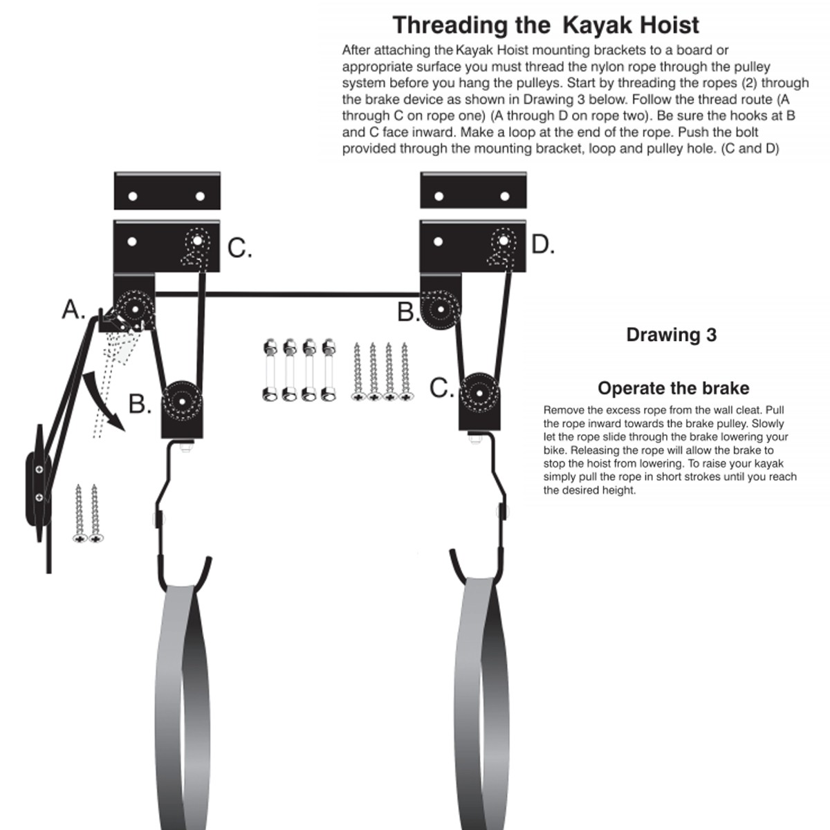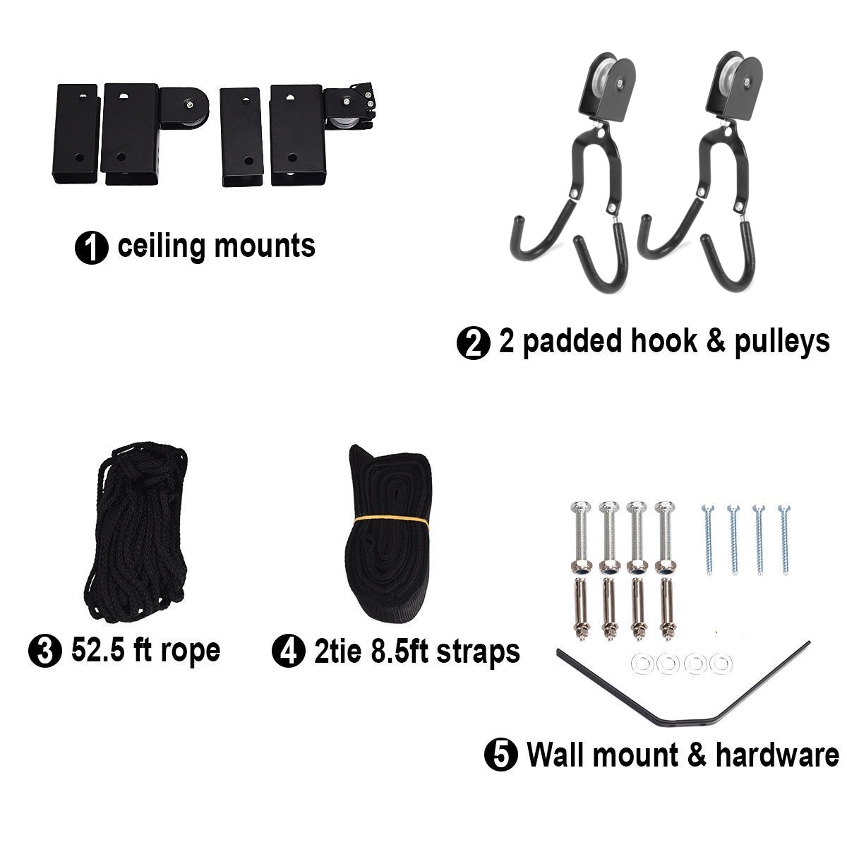 【PREMIUM & DURABLE MATERIAL】 Equipped with heavy-duty iron with rubber cover hooks and strong hardware, our kayak hoist is not only strong enough to hold up to 125 lbs, but also projects objects from scratching. The strong nylon rope is also durable and tear-resistant, making our hoist can be used for a long term.