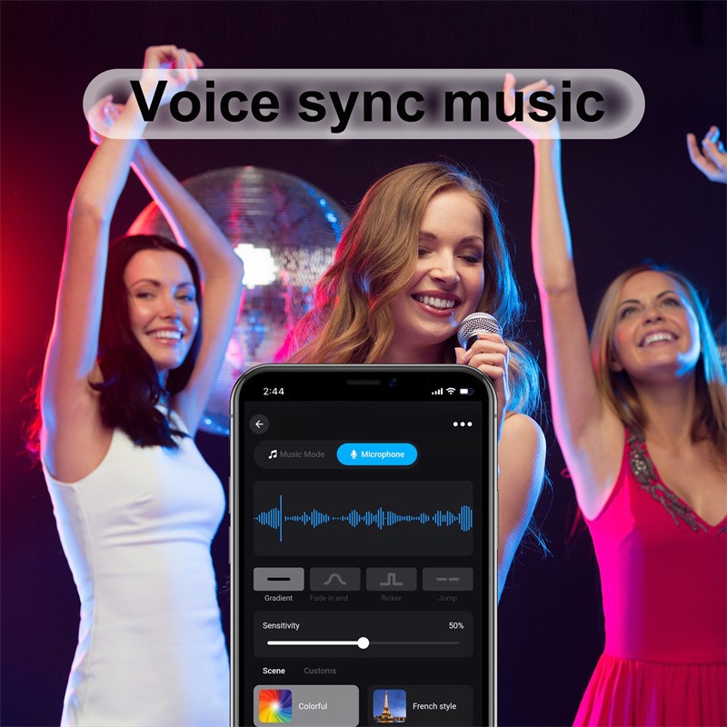 6. Microphone and music functions, the color of the light can change with the sounds of music, cinema, etc., and there are 10 kinds of colorful rhythm effects available.