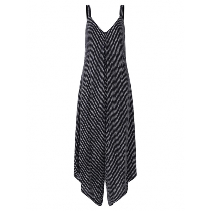 Sexy Women Spaghetti Strap V-Neck Striped Wide Leg Jumpsuit