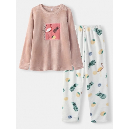 Women Flamingo Embroidery Flannel Thick Pineapple Print Pants Plus Size Pajamas Sets